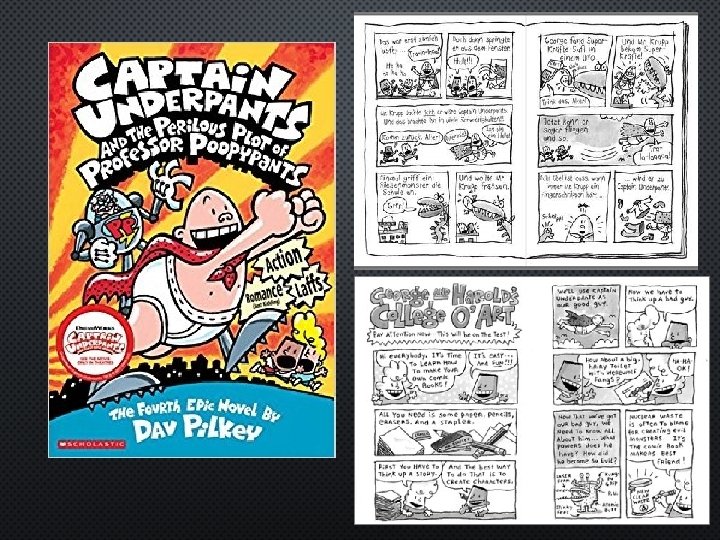 • ELEMENTS OF GRAPHIC NOVELS PANELS—SQUARES OR RECTANGLES THAT CONTAIN A SINGLE SCENE. • GUTTERS—SPACE BETWEEN PANELS. • DIALOGUE BALLOONS—THESE CONTAIN CONVERSATIONS BETWEEN CHARACTERS. • THOUGHT BALLOONS—THESE CONTAIN THE THOUGHTS OF A SINGLE CHARACTER. • CAPTIONS—THESE CONTAIN INFORMATION ABOUT A SCENE OR A CHARACTER. • SOUND EFFECTS—THESE ARE VISUAL SOUND CUES (I. E. WHAP,