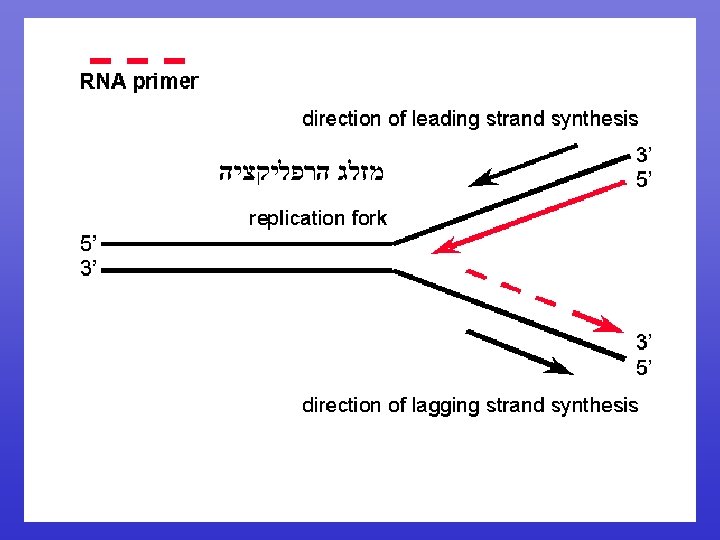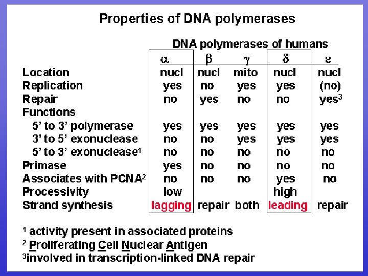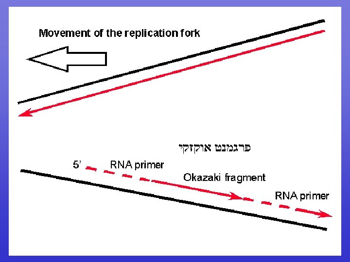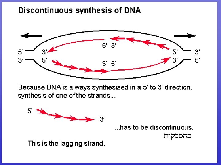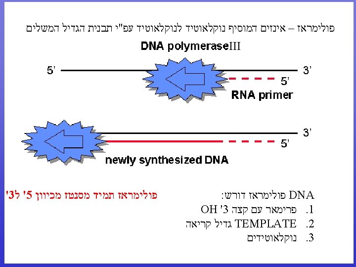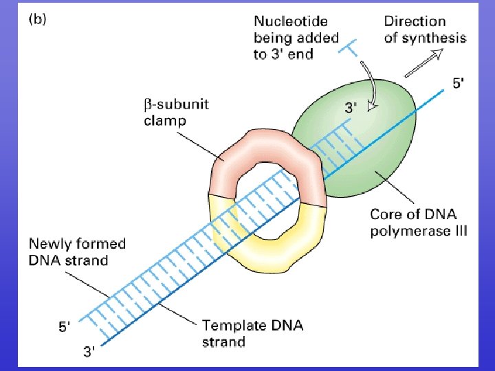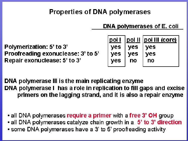 DNA Pol III activity • 5’ to 3’ DNA polymerase • Very processive: Once it locks on it does not let go • Very active: Adds 1, 000 nucleotides/sec! • High fidelity ( )מדויק : has a 3’ to 5’ exonuclease activity that removes mismatches