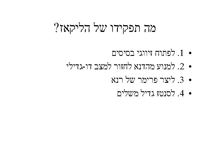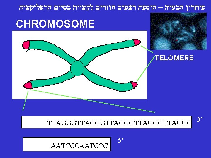 Functions ● ● ● Provide protection from enzymatic degradation and maintain chromosome stability מונע פרוק אינזימטי ושומר על הכרומוזומים Organization of the cellular nucleus by serving as attaching points to the nuclear matrix משמש נקודות מעגן למערך רשת הגרעין Allows end of linear DNA to be replicated completely מאפשר את סיום הרפליקציה של הכרומוזומים