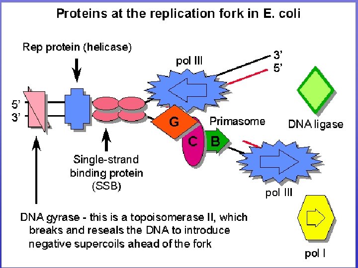 Simultaneous Replication Occurs via Looping of the Lagging Strand • Helicase unwinds helix • SSBPs prevent closure • DNA gyrase reduces tension • Association of core polymerase with template • DNA synthesis • Not shown: pol I, ligase