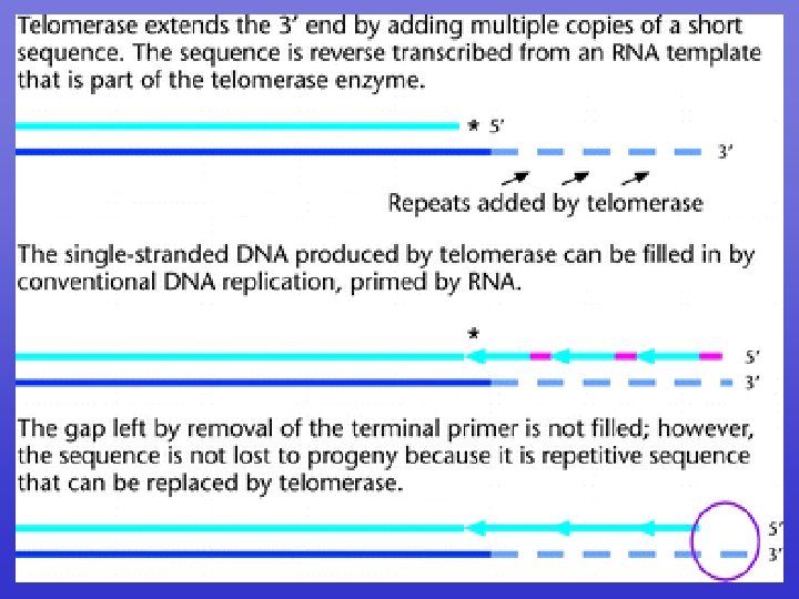 Telomerase 1. Telomerase binds to the telomer and the internal RNA component aligns with the existing telomer repeats. 2. Telomerase synthesizes new repeats using its own RNA component as a template 3. Telomerase repositions itself on the chromosome and the RNA template hybridizes with the DNA once more.
