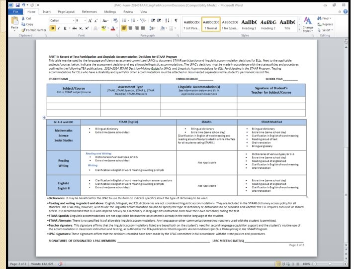 STAAR / TELPAS �Ratings on TELPAS affects the accommodations and tests students are allowed to take for STAAR ◦ Advanced High in reading will not allow students to take STAAR L