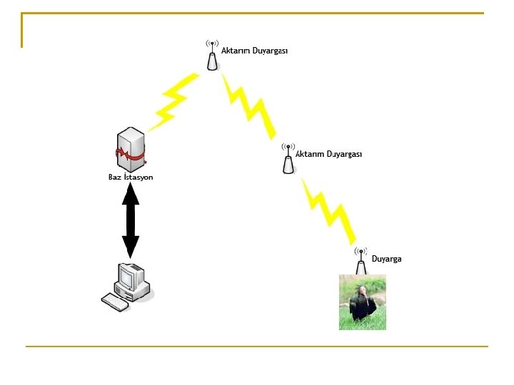Sistemin Altyapısı Duyargalar alana rastgele dağıtılırlar Bazı duyargalar baz istasyon düğümü(sink) ile doğrudan iletişim kurarken, bazıları ağaç(tree) ya da küme(cluster) yapısını kullanır(multi-hop) Her bir düğümün dört farklı radyo modu vardır; veri gönderme, veri alma, boş durma, uyuma.