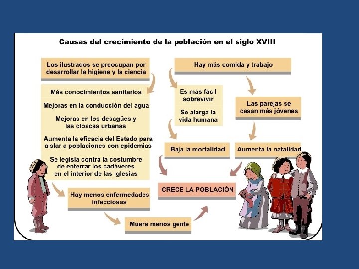 3. 1. LAS TRANSFORMACIONES DEMOGRÁFICAS • Durante el siglo XVIII, especialmente en la segunda mitad del siglo, la población europea va a experimentar un notable crecimiento motivado por el mayor espaciamiento o la desaparición de las crisis demográficas. Se siguen manteniendo las altas tasas de natalidad pero desciende la mortalidad debido a que se redujeron las malas cosechas y se produjeron menos epidemias y menos guerras. Durante el siglo XVIII, especialmente en la segunda mitad, se modificó el régimen demográfico en Europa produciéndose una expansión continua de la población. Se estima que la población europea pasó de 120 millones a comienzos del siglo XVIII, a 187 millones en 1789