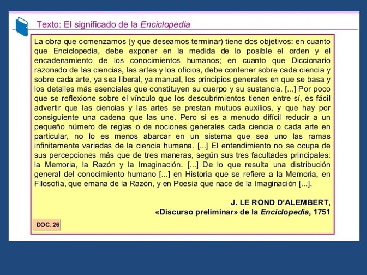Con la publicación de la Enciclopedia o Diccionario razonado de las ciencias, las artes y de los oficios, se pretendió recopilar todos los saberes de la época. Se publicó en 28 volúmenes en París, entre 1751 y 1772 y fue dirigida por Diderot y d´Alembert. En su elaboración colaboraron numerosos ilustrados de renombre de diferentes países.