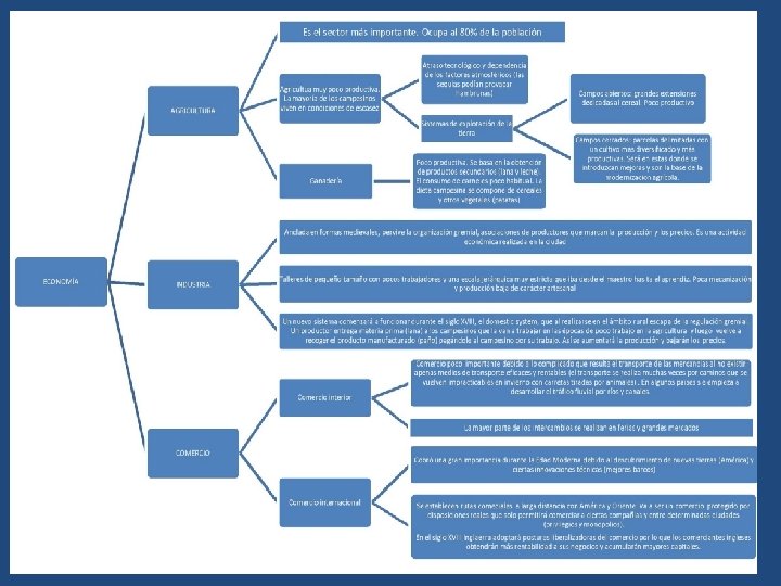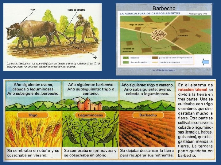 a) La agricultura • • Durante el Antiguo Régimen, la agricultura era la actividad más importante, ocupaba a la mayoría de la población (más del 80%). La posesión de la tierra era una importante fuente de poder y prestigio social, estando la mayor parte de ella en manos de la nobleza o de la Iglesia. Era una agricultura de tipo tradicional destinada al autoconsumo y caracterizada por una baja productividad debida a: ü la utilización de técnicas poco productivas (barbecho) y herramientas muy anticuadas. ü la estrecha dependencia de los fenómenos naturales (sequías inundaciones, heladas, plagas, etc. • • • Los cultivos más frecuentes eran los cereales, las legumbres, las plantas forrajeras, por el contrario el regadío estaba muy limitado. Como complemento a la agricultura se practicaba la ganadería (ovina y bovina). La producción de carne y leche resultaba muy reducida y la dieta de la población se basaba sobre todo en el consumo de cereales. La mayoría de los rebaños también estaban en manos de los estamentos privilegiados. Los campesinos vivían en condiciones de escasez, incluso de verdadera miseria, a ello se sumaba el pago de los impuestos que, durante la Edad Moderna, fueron creciendo de forma continua ya que las necesidades financieras de las monarquías fueron en aumento constante, a causa de las incesantes guerras y del incremento de las administraciones y la burocracia.