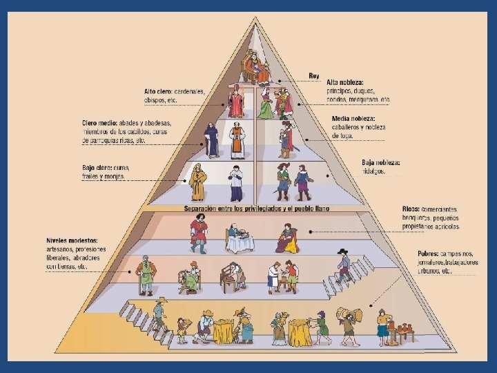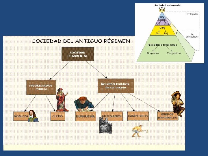1. 4. LA SOCIEDAD DEL ANTIGUO RÉGIMEN: UNA SOCIEDAD ESTAMENTAL • El modelo de sociedad característico del Antiguo Régimen era el estamental, esto es, dividida en estamentos (estados u órdenes) definidos por un común estilo de vida o análoga función social. Las características principales de esta sociedad estamental eran: – estaba formada por grupos cerrados a los que se pertenecía por nacimiento, – impermeabilidad social, esto es, resultaba muy difícil el ascenso o la promoción social, – desigualdad jurídica entre los estamentos: • los estamentos privilegiados (la nobleza y el clero) estaban exentos de pagar impuestos y tenían leyes y tribunales propios, • el estamento no privilegiado (el Tercer estado) estaba integrado por la mayoría de la sociedad y estaba obligado a pagar impuestos.