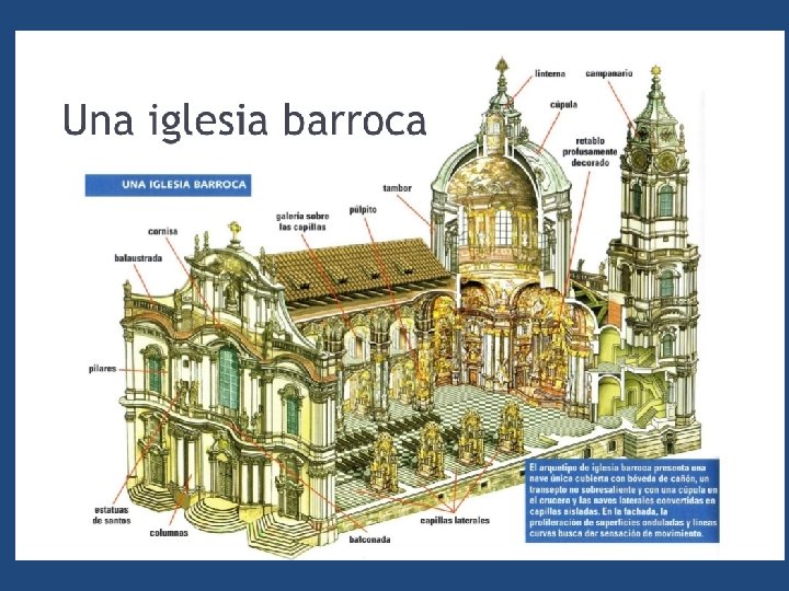 1. 5. 2. El arte del siglo XVII: El Barroco • El Barroco es un estilo artístico que surgió en Italia a finales del siglo XVI y se desarrolló en Europa durante todo el siglo XVII y la primera mitad del siglo XVIII. Se llama así por la abundancia de elementos decorativos que empleaba (barroco significa excesivamente recargado de adornos). • El arte barroco fue utilizado como instrumento de propaganda del poder político de las monarquías absolutas, los artistas fueron requeridos por los monarcas absolutos para construir mansiones que fueran el reflejo de su inmenso poder. • Así mismo, la Iglesia católica lo utilizó para reafirmar el catolicismo sobre la Reforma protestante. La Iglesia Católica se convirtió en la compradora de obras de arte y las iglesias mostraban una fastuosa decoración, dedicada a la propaganda de los principios religiosos. • En cambio, en los países protestantes las iglesias eran más austeras con ausencia de imágenes en sus templos. En estos países el barroco se presentó como un arte más íntimo y cotidiano. La burguesía encargó pinturas de menor tamaño para decorar sus viviendas, representando paisajes, escenas de la vida cotidiana, bodegones o retratos.