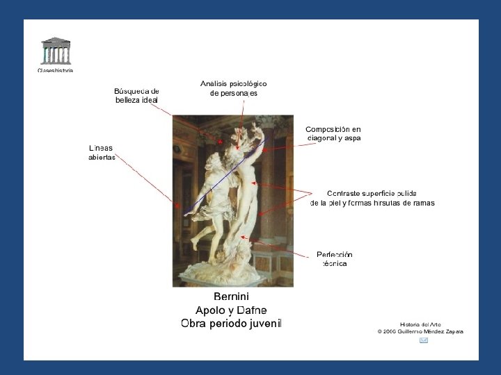 b) Escultura – La representación del movimiento fue también el principal objetivo de los escultores barrocos. Las figuras se representan en movimiento. Las líneas curvas y oblicuas se utilizan para dar la impresión de equilibrio inestable. – Los ropajes adquieren gran importancia: sus formas se hinchan y los pliegues se multiplican. – La otra gran aspiración de la escultura barroca es el naturalismo, con un carácter efectista que pretende conmover o sorprender, destacando la expresividad en los rostros. – Como material se empleaba fundamentalmente el mármol. – Además de los temas religiosos también se tratan temas mitológicos. – Bernini es la figura más representativa y sus obras son un reflejo de todas estas características.