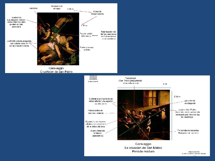 • La pintura barroca alcanzó pronto un gran desarrollo en Italia. Su iniciador fue Caravaggio, que introdujo “el tenebrismo” (juegos de contraste entre los fondos oscuros y focos de luz iluminando la escena). La crucifixión de San Pedro. Caravaggio La vocación de San Mateo. Caravaggio