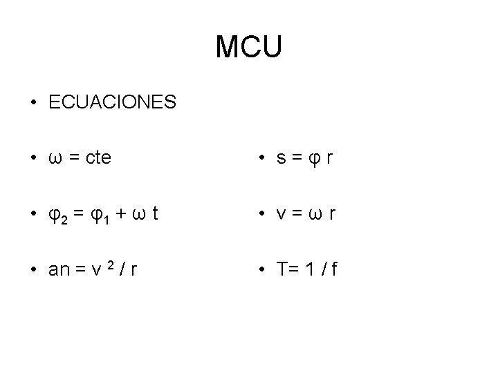 MCU: MAGNITUDES • • • VELOCIDAD ANGULAR ω Definición: ω = φ / t Unidades: radianes/ s rd/s Como MCU: ω = cte Relación: v = ω r