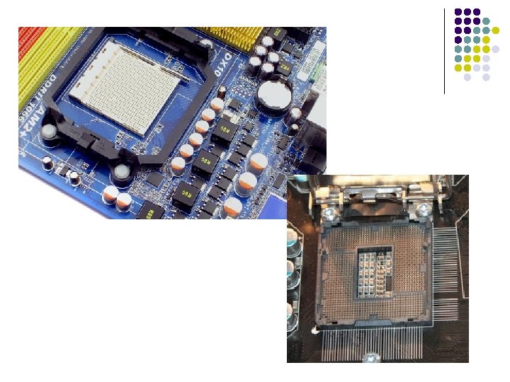 Socket A 462 -pin Usado por los micros AMD. Permite un gran tamaño de caché L 2. Socket 423 -pin Se usa con los Pentium 4, permite usar FSB de alta velocidad e incluye un disipador de calor. Socket 603 -pin Se usa para los Pentium 4 Xeon, permite caché de nivel L 3 y esta diseñada especialmente para usarse en entornos con varios procesadores. Socket 478 -pin Se usa con los Pentium 4 Northwood, construidos con tecnología de 0, 13 micras. Se reduce notablemente el tamaño tanto del socket como del micro. Socket 754 -pin Usado por los AMD Athlon de 64 bits. Socket 939 -pin Apareció hace poco, y es usado por todas las versiones de AMD Athlon 64 actualmente. LGA 775/ Socket T 775 -pin Land Grid Array 775: Se dejan de usar los pines que se utilizaban en el socket, y en su lugar se usan puntitos. Es el nuevo sistema de conexión de micros que usa Intel y es totalmente incompatible con los medios anteriores. En este diseño se han puesto los pines dentro del zócalo (socket) en vez de llevarlos el procesador. Esta medida la tomó Intel para pasarles el problema de la rotura de pines a los fabricantes de placas bases