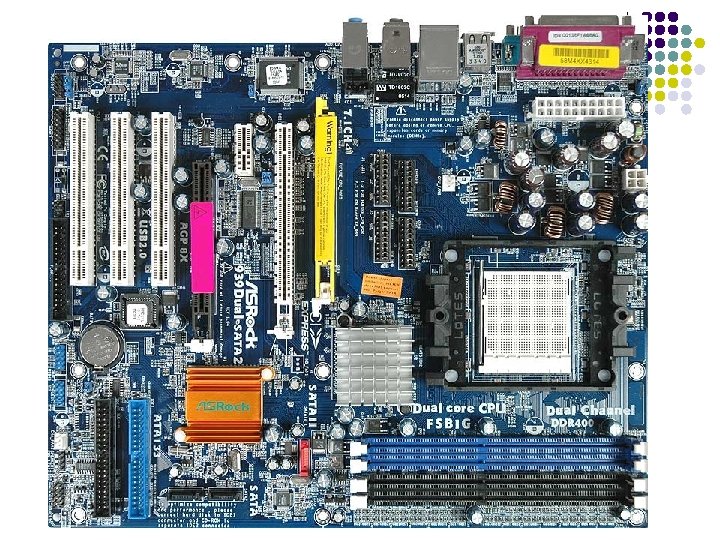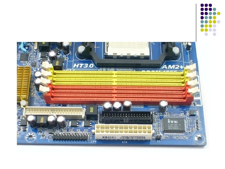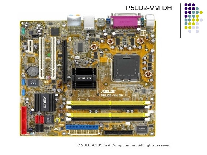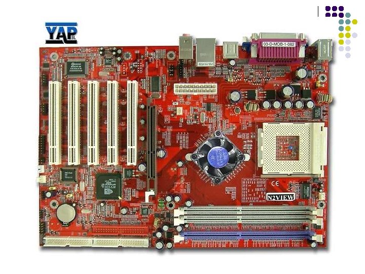1. LA PLACA BASE l También llamada “Placa principal” o “placa madre” es un gran circuito impreso en el que están situados los principales componentes electrónicos del ordenador, permitiendo una conexión entre ellos: l Microprocesador ( Zócalo ) l Memoria principal (Memoria RAM) l Ranuras de expansión l Puertos l Placas actuales: Tarjetas de sonido o gráficas. l Chipset