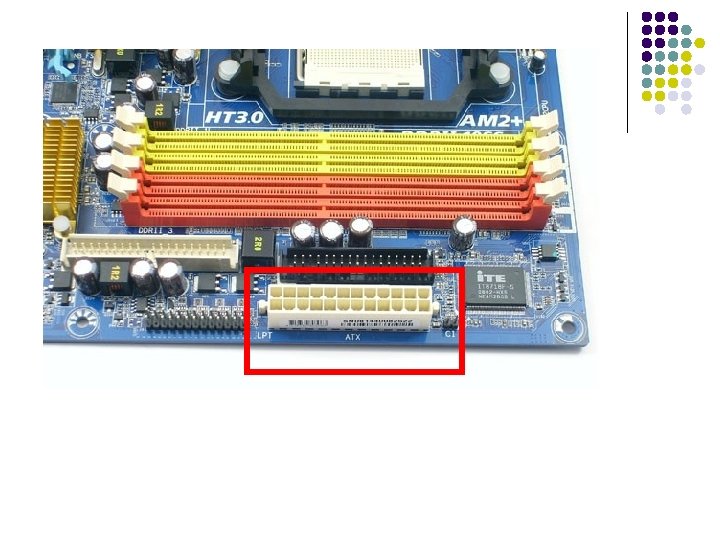 e. Conector de energía l En él conectaremos la terminación destinada a alimentar la placa base que trae la fuente de alimentación. l Según el factor de forma de la placa base este variará