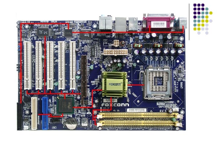 h. Buses l La información se transmite tanto en el interior del ordenador como en los dispositivos conectados a él a través de unos canales de comunicación denominados buses. l Los buses son los caminos por los que fluye la información. l Físicamente, están constituidos por finísimas líneas conductoras impresas sobre la placa base, por donde se transmiten por diferencia de tensión los datos e instrucciones en forma de señales digitales a velocidades muy altas.