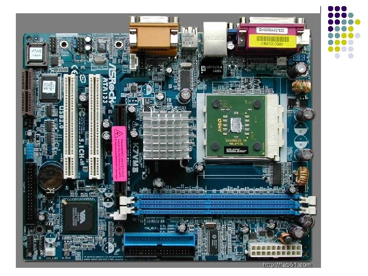 South. Bridge l Controla el trafico de los componentes del ordenador de menor frecuencia, es decir, de menor velocidad o más lentos del sistema, como son: l Puertos Serie, Paralelo, Infrarrojo y USB Dispositivos IDE y dispositivos ATA, etc. Disquetera Teclado y Ratón Funciones administración energía l l