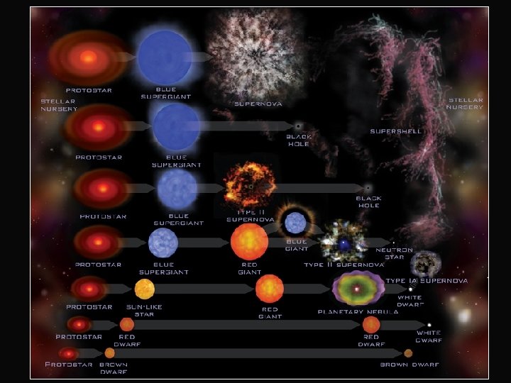 EVOLUCION DE UNA ESTRELLA optativo La evolución de una estrella depende de su masa: v. Estrellas con masa entre 0, 8 y 11 masas solares gigante roja-enana blanca. v. Masa entre 11 y 50 veces la masa del sol: supergigante roja o azul-supergigante roja-supernovaestrella de neutrones. v. Masa 30 veces mayor que el sol: supergigante azul-supernova-agujero negro http: //www. astrosurf. com/astronosur/estrellas 2. htm http: //www. youtube. com/watch? v=c. Gs 2 gu. Bushw&feature=related http: //www. taringa. net/posts/ciencia-educacion/5720859/Videos-de-Supernovas--y. Gigantes-Rojas-_-Info_. html