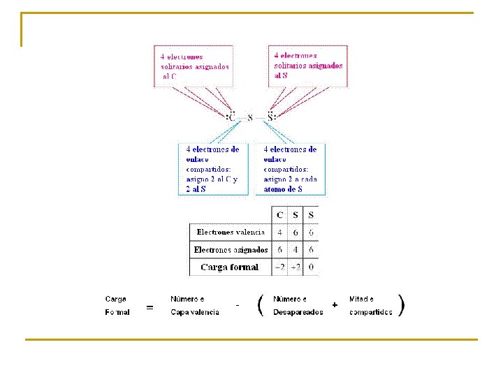 Cargas formales Para determinar cargas formales sobre los átomos: Carga Formal = Número e Capa valencia - Número e Desapareados + Mitad e compartidos