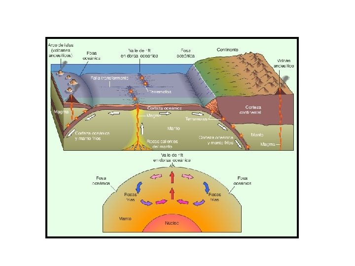 LÍMITE DE PLACAS • • Dorsales oceánicas: Cordilleras submarinas en las que se crea litosfera oceánica. Rift valley: Zonas continentales en las que se crea litosfera. Fosas oceánicas: Grandes fosas en las que se destruye litosfera oceánica. Fallas transformantes: Roturas en las dorsales en las ni se crea ni destruye litosfera.