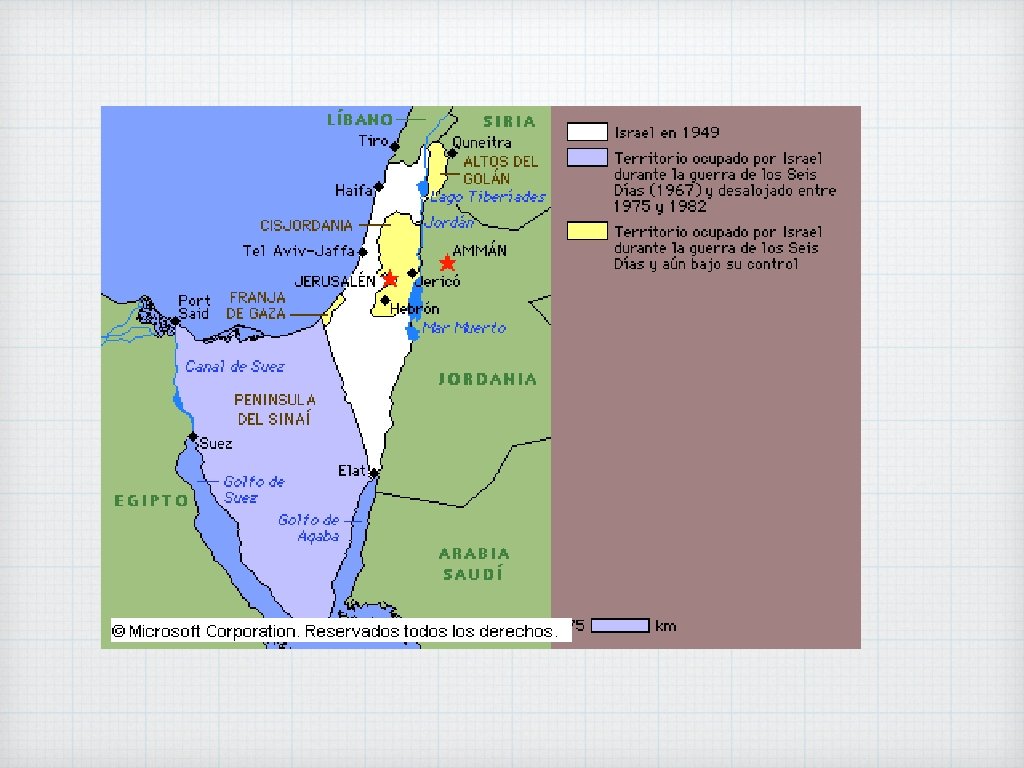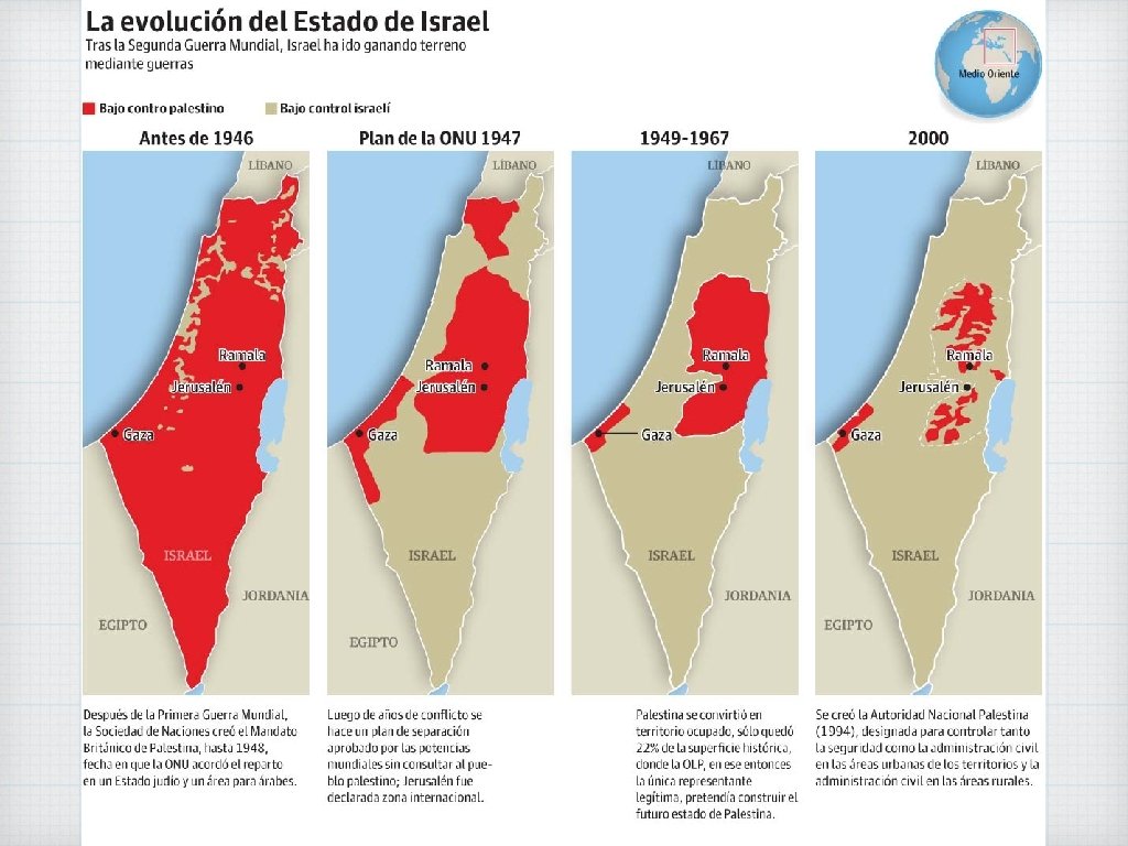 EL CONFLICTO ÁRABELas guerras árabe-israelíes ISRAELÍ • La primera guerra (1948) se produjo cuando los árabes atacaron al nuevo Estado de Israel. • La segunda guerra (1956) se debió a la ocupación francobritánica del canal de Suez. • La Guerra de los Seis Días (1967) provocó la ocupación judía de Gaza, Cisjordania, los altos del Golán y la península del Sinaí. • La Guerra de Yom Kippur aconteció en 1973. Tras ella, EE. UU. forzó la firma de los Acuerdos de Camp David que permitieron la paz entre Israel y Egipto. En 1964 los palestinos fundaron la Organización para la Liberación de Palestina (OLP) dirigida por Yasser Arafat. Inicialmente, fue un grupo terrorista, pero desde 1994 se convirtió en Autoridad Nacional Palestina con carácter de Gobierno provisional.