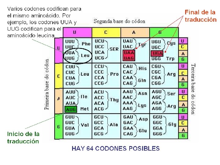 2. 1 Características del código genético La práctica totalidad de los organismos comparten un mismo código genético. El código genético comprende toda la información almacenada en el ADN. Cada uno de los 64 codones identifica a los 20 aminoácidos proteicos y a varias señales de iniciación y terminación de la síntesis proteica.