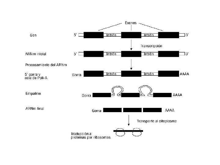 • EUCARIONTES Maduran todos los ARN siendo la más importante la del ARNm - Se añade al extremo 5´del ARNm primario una caperuza de metilguanosina, que evita su degradación y ayuda en el reconocimiento de los ribosomas el lugar de inicio de la traducción. - Se añade al extremo 3´del ARNm primario una cola poli-A, que evita su degradación y ayuda en la salida al citoplasma. - Cada gen posee fragmentos de intrones y exones, los intrones solo se transcriben y los exones se transcriben y se traducen. El ARNm primario contiene intrones y exones. En el proceso de maduración se eliminan los intrones y se ensamblan los exones por un proceso conocido como splicing (empalme). Los intrones forman un bucle, acercándose los exones, se producen unos cortes y los intrones desaparecen, y los exones se sueldan No se sabe bien el papel de los intrones. La maduración se produce a veces de formas diferentes y esto implica que un mismo gen pueda codificar diferentes proteínas.