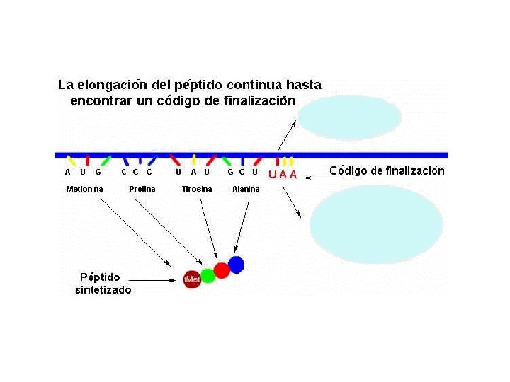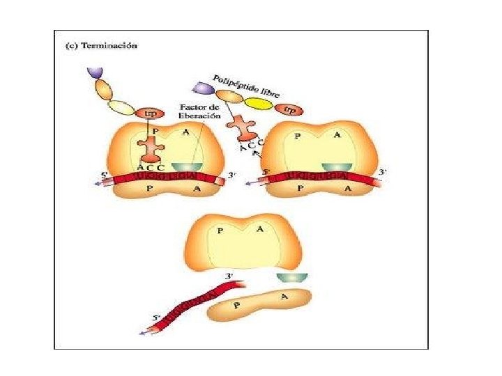 • FASE DE TERMINACIÓN Se produce cuando el péptido ha alcanzado su tamaño y aparece uno de los tres codones de final de lectura, UAA, UGA, UAG. (STOP) Con la ayuda de factores de liberación , la cadena en formación polipeptidil- ARNt se encuentra en el locus P y uno de los tres codones de final de lectura en el locus A. Ningún ARNt reconoce dicho codón y la peptidil transferasa actúa como hidrolasa y libera el péptido , lo separa del ARNt. Se separan las subunidades ribosómicas y el ARNm ( desensamblaje total)