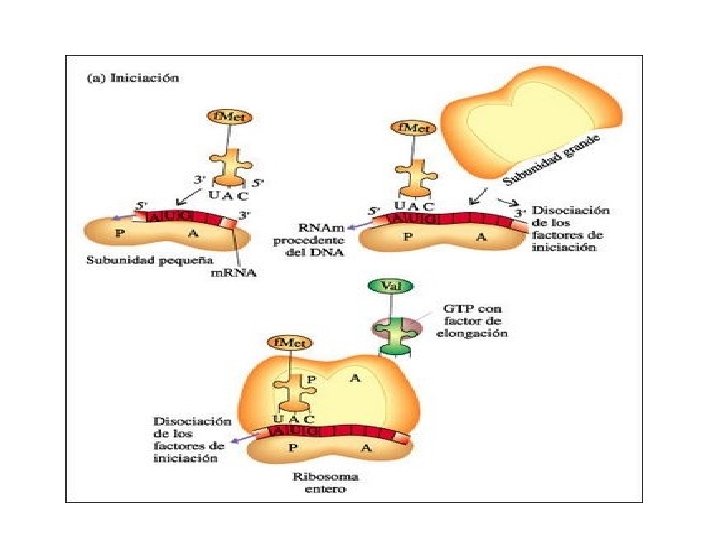 • FASE DE INICIACIÓN La subunidad menor del ribosoma se une al ARNm por el extremo 5´donde se sitúa el codón de iniciación ( AUG) con la ayuda de factores de iniciación. Se une el primer aminoacil-ARNt, que es la metionina ( en eucariontes, en procariontes es la formil metionina) Se une la subunidad grande del ribosoma utilizando energía del GTP. . Posee dos locus o sitios, el locus P en el que se encuentra el primer aminoacil-ARNt y el locus A que de momento está libre y se sitúa a la altura del siguiente codón para la entrada de otro aminoacil ARNt. Se liberan los factores de iniciación y GDP