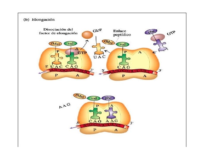 • FASE DE ELONGACIÓN - FIJACIÓN DEL SIGUIENTE AMINOACIL-ARNt Con la ayuda de factores de elongación , se produce la entrada del 2º amoniacil. ARNt a la altura del siguiente codón en el locus A con la ayuda del GTP. , El anticodón del ARNt reconoce el codón del ARNm y se mantienen unidos por enlaces de hidrógeno.