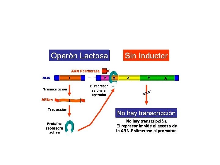 7. REGULACIÓN DE LOS GENES Las células no siempre sintetizan las proteínas para las que tiene información, solo aquellas que cada célula necesita. Se realiza de diferentes formas y en distintos lugares. MODELO OPERÓN ( En procariontes) Un operón está formad por un conjunto de genes: - Gen regulador: Secuencia de ADN que codifica a una proteina que funciona como represora - Gen promotor: Secuencia de ADN a la que se une la enzima ARNpolimerasa para iniciar la transcripción. - Gen operador: Secuencia de ADN situada entre el promotor y los genes estructurales y al que puede unirse el represor activo. Los genes estructurales sintetizan la proteína, siempre que el modelo no bloquee el proceso.