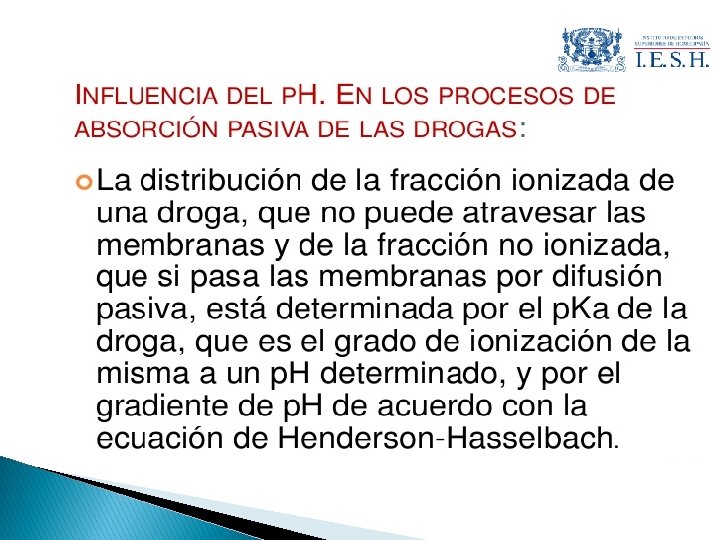 � La proporción entre las formas ionizada y no ionizada de la droga a cada valor de p. H puede calcularse con la ecuación de Henderson- Hasselbalch.