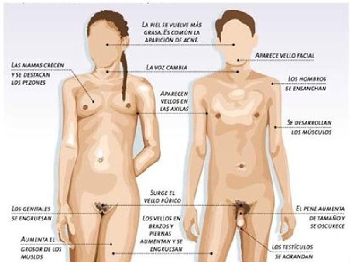Punto 3: pubertad y adolescencia • La pubertad es el conjunto de cambios físicos que afectan a las personas durante la segunda década de su vida. En ella, el cuerpo se transforma y pasa a tener un aspecto de cuerpo adulto. Este proceso se caracteriza por una rápido crecimiento y el desarrollo de los caracteres sexuales. Existen diferencias entre niños y niñas; la principal es que las niñas suelen empezar a desarrollarse dos años antes que los niños. • La adolescencia es un cambio hace referencia a los cambios psíquicos que facilitan la transición de la infancia a la adultez, suele iniciarse durante la pubertad y se alarga unos cuantos años.