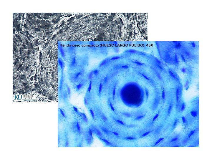 Tipos de tejido óseo Tejido óseo compacto : Se encuentra en la diafisis o parte media de los huesos largos. – Está formado por conjuntos de finas láminas de matriz calcificada en forma de anillos concéntricos. – Estas láminas están surcadas por pequeñas lagunas que contienen las células óseas u osteocitos. – Las lagunas están comunicadas entre sí por finos canales. – Cada conjunto de laminillas forma una estructura cilíndrica llamada sistema de Havers por cuya parte central discurren vasos sanguíneos y nervios. – Un hueso compacto está formado por conjuntos de sistemas de Havers fuertemente unidos entre sí y conectados por vasos y nervios.