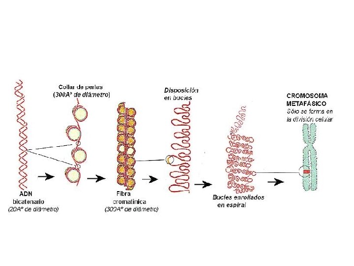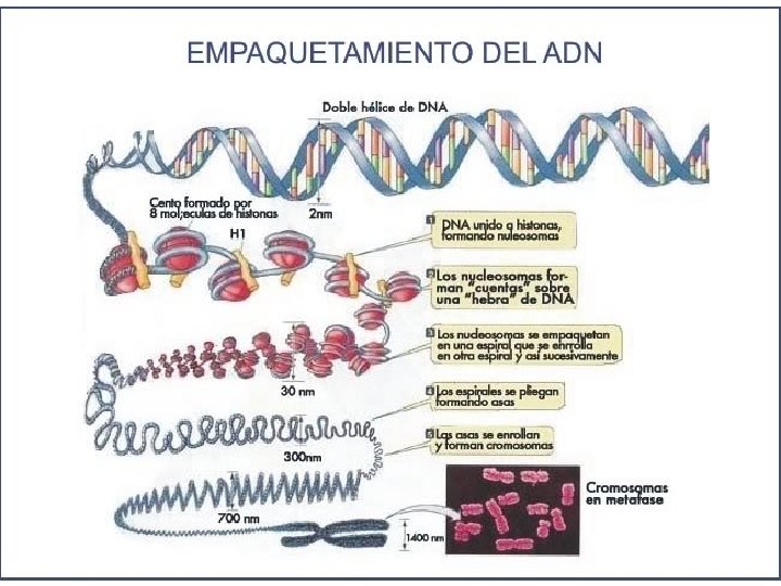 Las moléculas de ADN son muy largas; así en las células superiores (eucarióticas), el conjunto de las moléculas de ADN que hay en el núcleo puede medir más de 1 m de longitud. Lógicamente, para que estas moléculas puedan caber en un núcleo cuyo diámetro es de 10 μm tienen que estar muy replegadas o empaquetadas. El ADN consigue una elevada condensación gracias a los diferentes niveles estructurales que presenta, aunque en todas las células eucariotas, el ADN se empaqueta aún más, gracias a su unión con las histonas. Gracias a esta asociación podemos distinguir distintos niveles de empaquetamiento:
