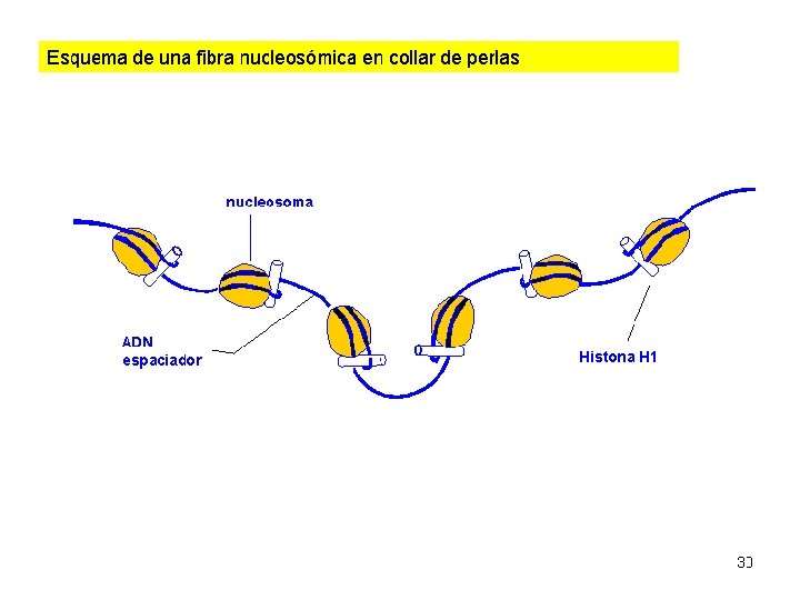 • Primer nivel de empaquetamiento o fibra de cromatina de 100 Å. Es conocido como <<collar de perlas >>. Está constituida por la fibra de ADN de 20 Å (doble hélice) asociada a histonas, las cuales son proteínas básicas de baja masa molecular. • Este collar de perlas se encuentra en el núcleo durante la interfase del ciclo celular de todas las células eucariotas. Estructuralmente esta fibra de cromatina está constituida por una sucesión de nucleosomas. Cada uno de estos está formado por un octámero de histonas y por una fibra de ADN de 200 pares de bases de longitud. El ADN que hay entre un octámero y el siguiente se denomina ADN espaciador.