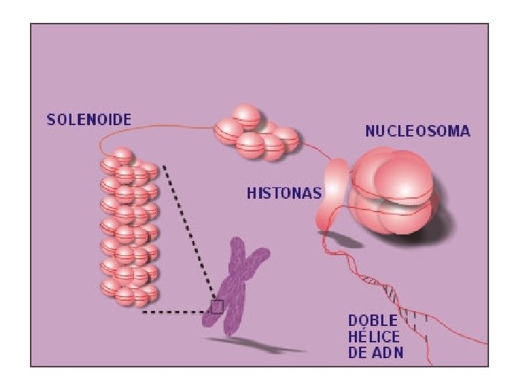 Los nucléolos: Masas esféricas que contienen concentraciones elevadas de ARN y proteínas. La función principal del nucléolo es la producción y ensamblaje de los componentes ribosómicos. Desaparecen al principio de la división celular y aparecen al final. La cromatina y los cromosomas: Son dos denominaciones correspondientes a la misma estructura en diferentes momentos de la célula. Formados por la asociación del ADN con proteínas ( histonas y otras proteínas). La cromatina cuando el núcleo está en reposo y los cromosomas se forman cuando se inicia el proceso de división celular.