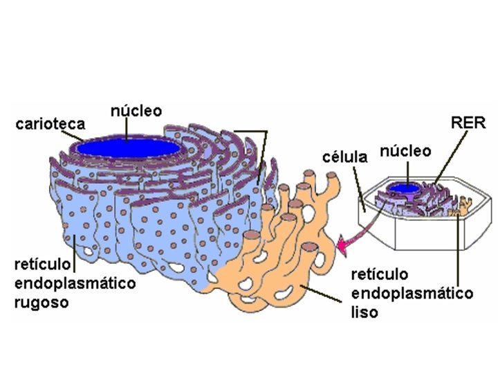 Se pueden distinguir dos tipos de retículo: 1. El Retículo endoplasmático rugoso (R. E. R. ), presenta ribosomas unidos a su membrana. En el se realiza la síntesis proteica. Las proteínas sintetizadas por los ribosomas, pasan al lumen del retículo y aquí maduran hasta ser exportadas a su destino definitivo. 2. El retículo endoplásmico liso (R. E. L. ), carece de ribosomas y esta formado por túbulos ramificados y pequeñas vesículas esféricas. En este retículo se realiza la síntesis de lípidos.