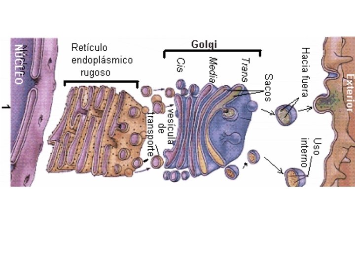 El complejo o aparato de Golgi: es un conjunto de unidades estructurales denominadas dictiosomas que se encuentran próximas al núcleo. Cada uno de ellos está formado por el apilamiento de varios sacos llamados cisternas de Golgi. Del exterior de estos sacos se desprenden, por gemación una serie de gránulos llamados vesículas de Golgi. El dictiosoma se encuentra en íntima relación con el retículo endoplásmico, lo que permite diferenciar dos caras: la cara cis, más próxima al retículo, y la cara trans, más alejada. En la cara cis se encuentran las vesículas de transición , mientras que en la cara trans, se localizan las vesículas de secreción. La adquisición de sustancias se lleva a cabo por endocitosis, mecanismo que consiste en englobar sustancias con la membrana plasmática para su posterior internalización. La expulsión de sustancias se realiza por exocitosis , mecanismo que, en último término, consiste en la fusión con la membrana celular de las vesículas que contienen la sustancia a exportar.