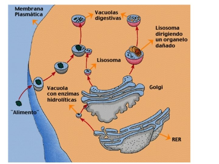 Los lisosomas: Son pequeños orgánulos que se encuentran dispersos por el hialoplasma de las células. Los lisosomas tienen una estructura muy sencilla, semejantes a vacuolas, rodeados solamente por una membrana, contienen gran cantidad de enzimas digestivas (estómagos de la célula) que degradan todas las moléculas que penetran en su interior procedentes del exterior o del interior celular.