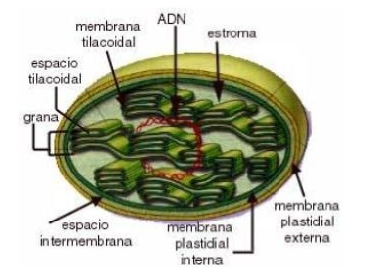 Un cloroplasto tiene tres membranas y presenta tres compartimentos. La membrana externa es muy permeable, la membrana interna es menos permeable, no presenta pliegues. Entre ambas membranas queda un primer compartimento que es el espacio intermembrana. La membrana interna delimita un espacio que es el estroma, dónde se encuentran ribosomas plastidiales, ADN plastidial, distintos tipos de ARN, gránulos de almidón y gotas de lípidos. La membrana tilacoidal, es el tercer tipo de membrana, aparece formando unos sacos aplanados denominados tilacoides o lamelas, y forman unas agrupaciones llamadas grana. Los tilacoides están interconectados y delimitan una tercera cavidad que es el espacio tilacoidal.