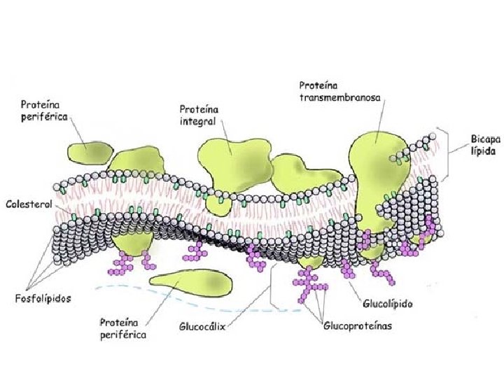 LA MEMBRANA PLASMÁTICA La membrana plasmática es una delgada lámina de 75 Å (1 Å= 1 x 10 -10 m = 0, 1 nm) que envuelve a la célula y la separa del medio externo. Puede variar su forma permitiendo movimientos y desplazamientos de la célula. Su estructura es igual en todas las células y en todos los orgánulos citoplasmáticos, por lo que se llama membrana unitaria. Según Singer y Nicholson (1972) es una bicapa lipídica, asociada con moléculas de proteínas, formando la estructura de mosaico fluido. Posee una composición química de 52% de proteínas, 40% de lípidos y 8% de azúcares.