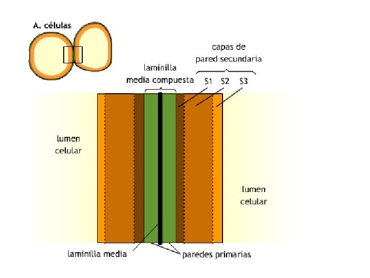 La pared celular está formada por celulosa, y contiene una alta proporción de agua (80%). En ella podemos distinguir como máximo tres capas; comenzando desde el exterior y hacia el interior de la célula, estas capas se llaman: lámina media, pared primaria y pared secundaria. Lamina media: se forma como placa celular en el momento de la división celular y puede ser compartida por varias células. Es una capa muy fina formada principalmente por pectinas y proteínas. Pared primaria: capa más gruesa que la lámina media. Se forma inmediatamente después de la división celular, antes de que la célula complete su crecimiento. Se encuentra formada por microfibrillas de celulosa entrecruzadas, como si formaran una malla poco densa. También hay hemicelulosa y pectina. En algunas células es la única capa que existe, pudiendo variar de grosor e impregnarse de lignina, que proporciona rigidez a la planta. Pared secundaria: aparece sólo en algunos tipos celulares. Está formada por celulosa y lignina (o suberina) y en ella podemos distinguir las capas S 1 (externa), S 2 (capa medial o central) y S 3 (interna).