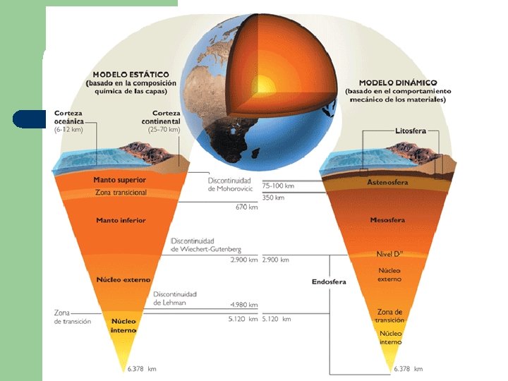 Capas de la Tierra Tiene un radio de 6370 Km. l Corteza (de 3 a 70 km espesor). Se diferencia en continental y oceánica. l Manto (2900 km de espesor). Se distinguen el manto superior y el inferior. l Núcleo compuesto de hierro y níquel a grandes presiones y temperaturas. Se divide en externo (fluído) e interno (sólido)