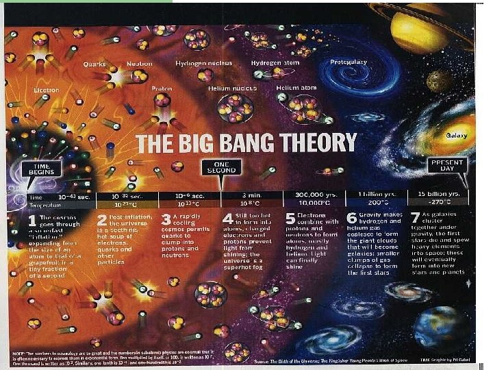 EL BIG BANG l l l Se produjo entre 13500 y 14000 millones de años. Significa “gran estallido”, supone el origen del Universo. La materia ocupa un punto de “densidad infinita” que explota lanzando la materia en todas las direcciones que se alejan unas de otras. La materia está constituida exclusivamente por partículas elementales: Electrones, Positrones, Mesones, Bariones, Neutrinos, Fotones y un largo etcétera hasta más de 89 partículas conocidas hoy en día. En ese instante comienza el espacio y el tiempo del Universo.