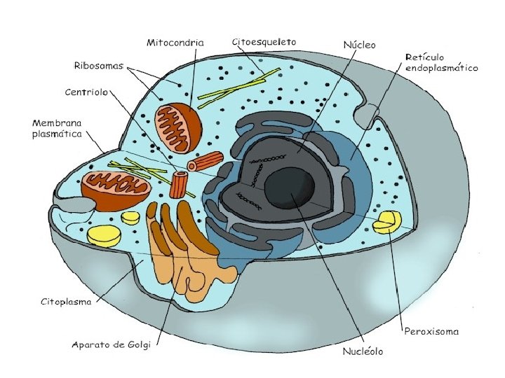 La célula animal • Membrana plasmática: bicapa lipídica con proteínas. • Citoplasma: con el citosol o hialoplasma y con orgánulos (compartimentos rodeados de membrana) – – – – Citoequeleto, Centrosoma, Retículo endoplasmático, Aparato de Golgi, Lisosoma, Mitocondrias, Núcleo