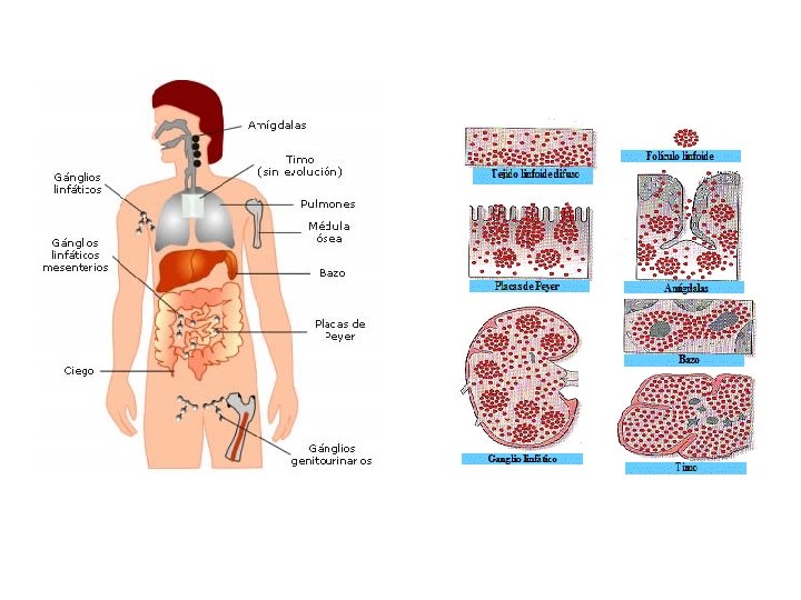 • ORGANOS LINFOIDES SECUNDARIOS En ellos se acumulan los linfocitos y son los encargados de atrapar a los antígenos e iniciar la respuesta inmune específica adquirida. - BAZO. Órgano esponjoso situado detrás del estómago junto a las costillas y se rompe fácilmente. Su función es la filtración de la sangre. Elimina las células sanguíneas viejas y atrapa los antígenos procedentes de la circulación y desarrolla la respuesta específica inmune. - GANGLIOS LINFÁTICOS. Pequeñas masas de tejido linfoide encapsulado en distintas zonas ( cuello, axilas, ingles, cavidad abdominal …). Es un centro de vigilancia local o regional. Los linfocitos T reconocen los antígenos y se desencadena la respuesta inmune. - TEJIDO LINFOIDE ASOCIADO A MUCOSAS (MALT) Masas de tejido linfoide no encapsulado. Aparece en mucosas (amígdalas, placas de Peyer del intestino delgado, apéndice, tejido linfoide asociado a bronquios y al aparato urogenital, istmo de las fauces. . . Todas estas son zonas de acúmulo de linfocitos.