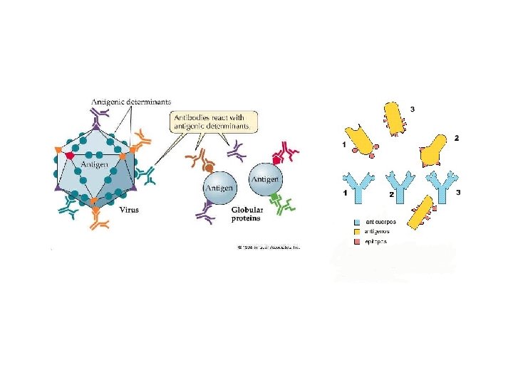 6. MOLÉCULAS DEL SIST. INMUNITARIO • ANTÍGENOS - CARACTERÍSTICAS Son moléculas que generan una respuesta inmune. La zona reconocida por el anticuerpo se denomina epítopo o determinante antigénico Son mayoritariamente proteínas, algunos son polisacáridos, lípidos complejos o glucoproteínas. En el caso de las proteínas presentan estructura terciaria. -TIPOS. Heteroantígenos o Xenoantígenos: Proceden de otra especie. Son moléculas, ubicadas en cápsidas víricas, paredes bacterianas, superficie celular o moléculas liberadas por células, como las toxinas. Aloantígenos/Isoantígenos: Procedentes de individuos de la misma especie pero genéticamente diferentes. Ej: Grupos sanguíneos. Autoantígenos: Procedente del mismo individuo, son los menos corrientes.