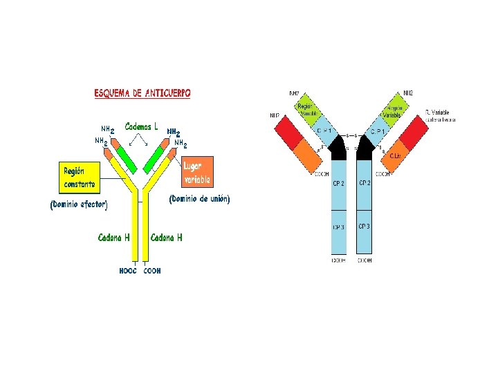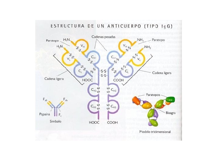 • ANTICUERPOS - - CARACTERÍSTICAS Son glucoproteínas globulares: Inmunoglobulinas (Ig) Son producidas por los linfocitos B y son las responsables de la respuesta inmune humoral. Se encuentran en el suero, líquido intersticial, sobre los epitelios o en la superficie de los linfocitos B. ESTRUCTURA. Tienen forma de Y, con cuatro cadenas polipeptídicas unidas por puentes disulfuro. Presentan: Dos cadenas ligeras idénticas de unos 200 aa divididas en dos zonas la variable (VL) que presenta un amino terminal y la zona constante (CL) con un carboxilo terminal Dos cadenas pesadas identicas de unos 400 aa. , dividida en cuatro zonas una variable (VH) con extremo amino terminal y tres constantes (CH) con carboxilo terminal. El parátopo es la zona del anticuerpo que reconoce el epítopo del antígeno.