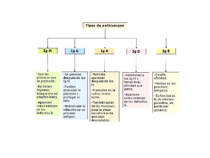 - TIPOS En vertebrados superiores existen cinco según el tipo de cadena pesada. Ig M: Forman entre el 5% y 10% de los anticuerpos. Son pentámeros y son los más grandes. Son los primeros anticuerpos presentes en la sangre, permanecen unos 10 días y son responsables de la respuesta secundaria. Activan fagocitos Ig G: Forman el 80%. Son monómeros. Se producen en la respuesta secundaria a un antígeno originada por las células B memoria. Proporcionan resistencia a largo plazo. Ig A: Forman entre el 10% y el 15%. Suelen ser dímeros: Se acumulan en secreciones corporales ( lágrimas, leche, saliva, mucus, tractos digestivo, respiratorio y urinario). Inhibe la adhesión de los parásitos a tejidos. Ig E: Menos del 1%. Son monómeros. Se encuentran sobre todo en la piel. Son unos de los anticuerpos responsables de las alergias. Protección frente a parásitos metazoos. Ig D. Menos del 1%. Son monómeros. Se encuentran en la membrana de los linfocitos B
