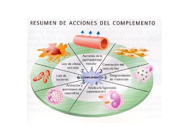 • SISTEMA DEL COMPLEMENTO Está formado por un grupo de unas 30 proteínas plasmáticas que se sintetizan en el hígado, y se encuentran en estado inactivo. Actúan en cascada, de manera que unos componentes activan a otros. Se complementa y potencia la respuesta inmune. Favorecen la dilatación y permeabilidad de los capilares, produciendo inflamación, para hacer llegar a la zona afectada la llegada de leucocitos. Provoca la lisis de células invasoras a través de la rotura de sus membranas. Señalan las células extrañas para el reconocimento de macrófagos y anticuerpos.